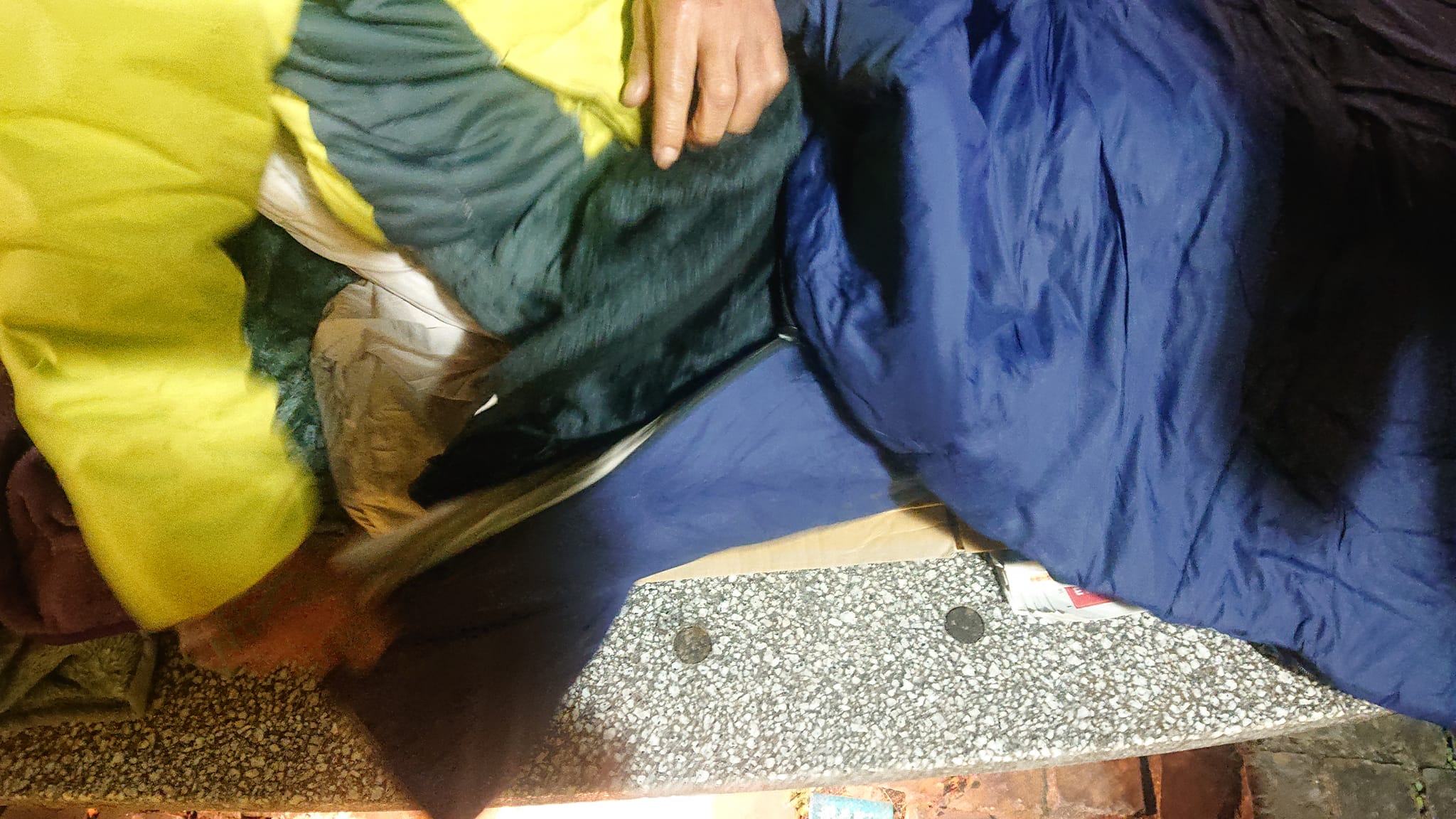 夜回りで3日前に話した【屋根の無い路上で毎日寝ている】方に、ボランティア団体から寝袋を渡す事が出来て、ひざづめで(️寝泊まりしている屋外の所に私も座り、️左が私の足。当事者の方は段ボールのすぐ右に居て)『明日以降の暮らし』についてじっくりお話を伺いました。