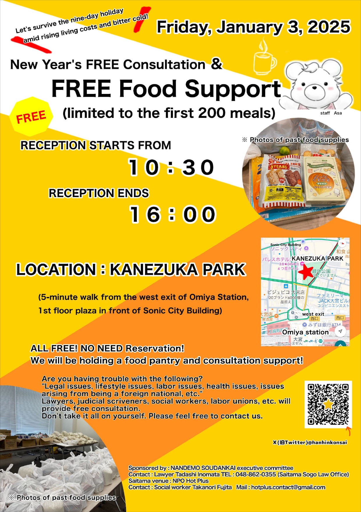 今回、相談会の6時間、『電話相談』対応も公共施設が借りられず、ずっとテント内(言い換えれば、外)で行って下さいました。相談中、動けないから寒かったでしょう。”動ける時”は、弁護士など他の相談ブースに飛んでいく時です(電話相談は合計8時間)。”全国一斉”なので他県の電話がパンクすれば回って来ている事が分かります。会場にたまたま来てくれた専門家を『電話相談』ボランティアさんに紹介しようとして、1件の相談が長い事が少なくないので、長い時間待って頂きました。