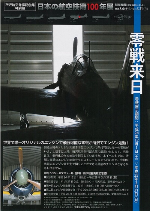 所沢航空記念発祥記念館にて、世界で唯一、飛行できるゼロ戦を展示中(8月末まで)。