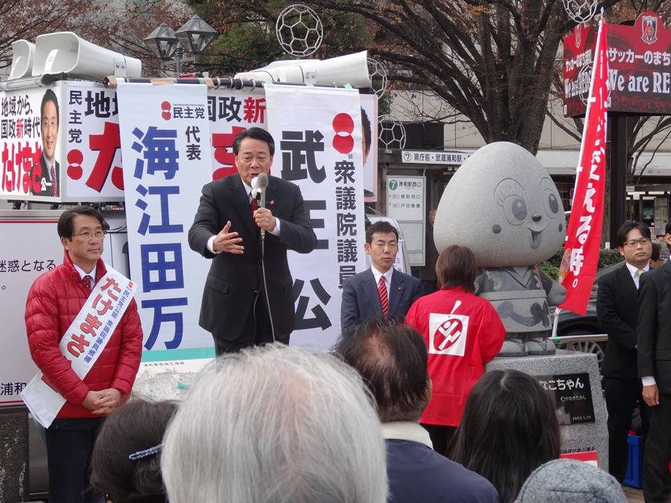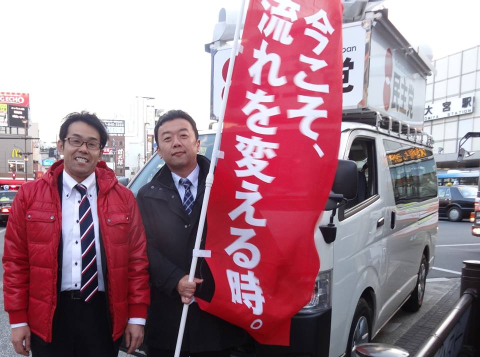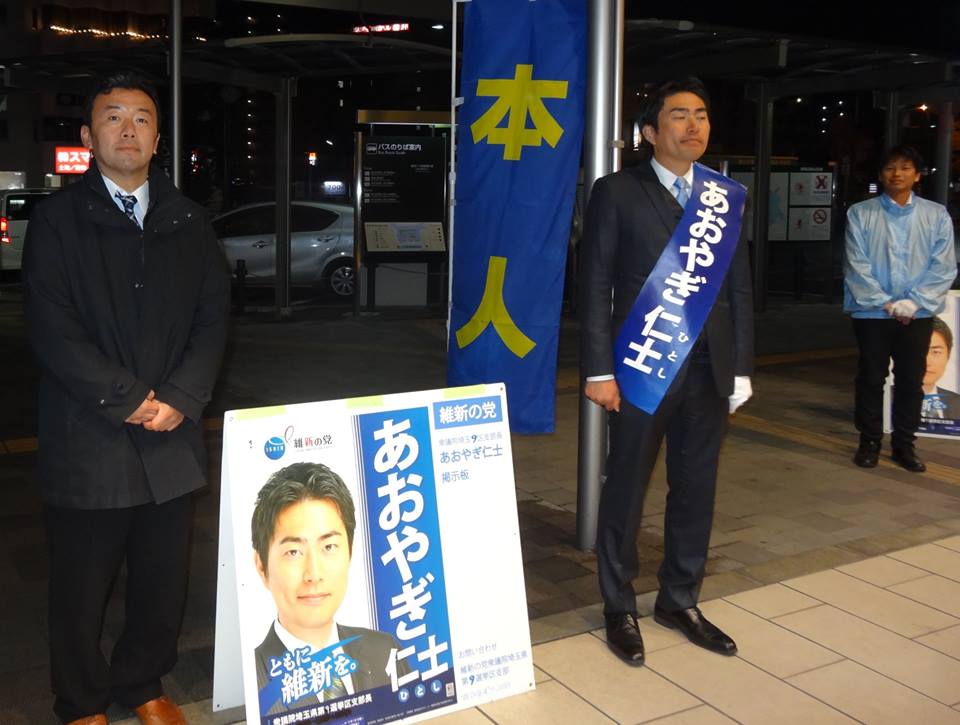 今日10時半から狭山市駅西口で、維新の党共同代表の江田憲司さんが来て、青柳さんとの街頭演説会がありました。