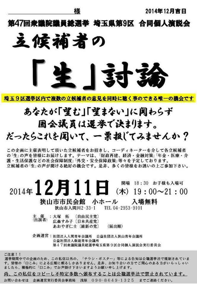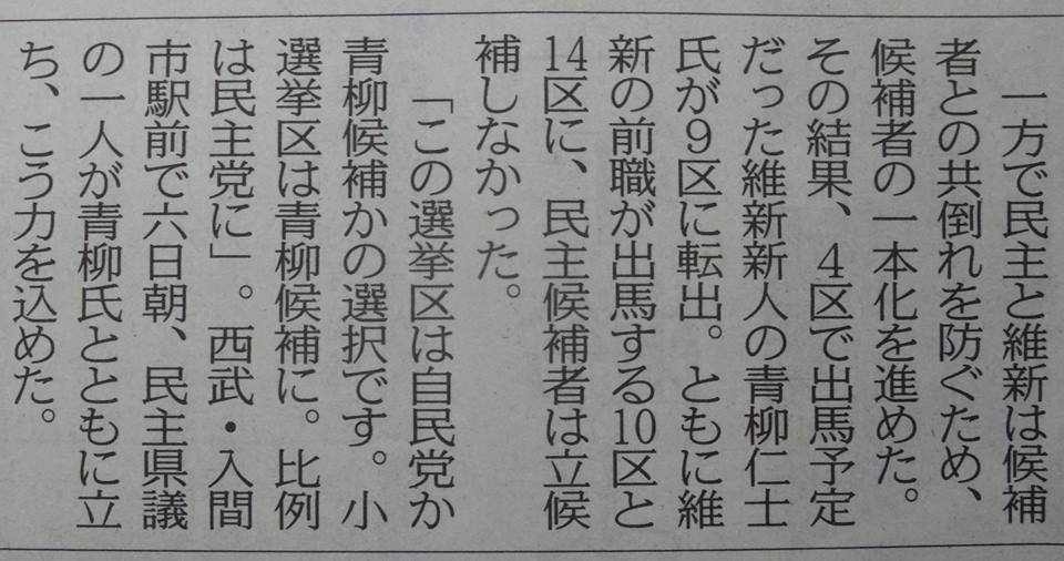 狭山市などの選挙区は、野党共闘で、青柳仁士さんが立候補。(青柳さんは前回の衆院選で、朝霞市などの選挙区で立候補しましたが、民主党の候補とバッティングしているので、選挙区替えでこちらに来ました。)