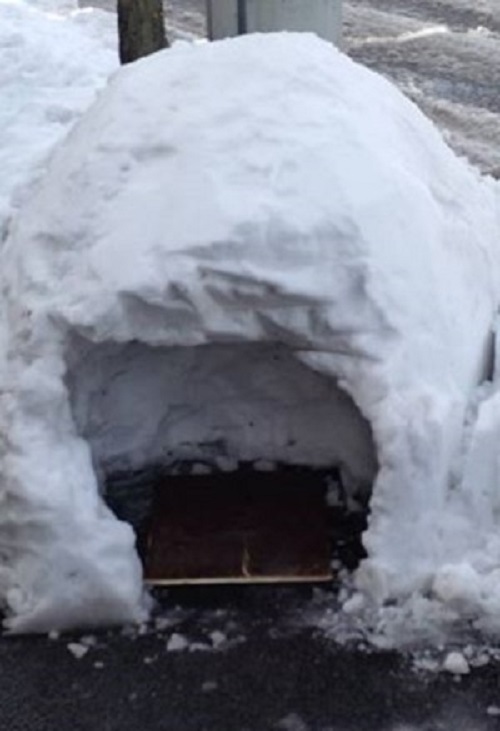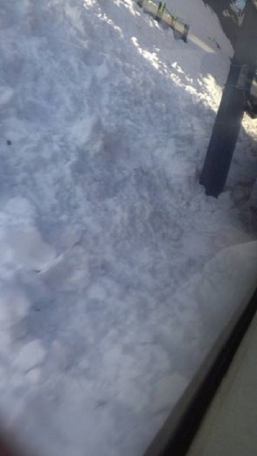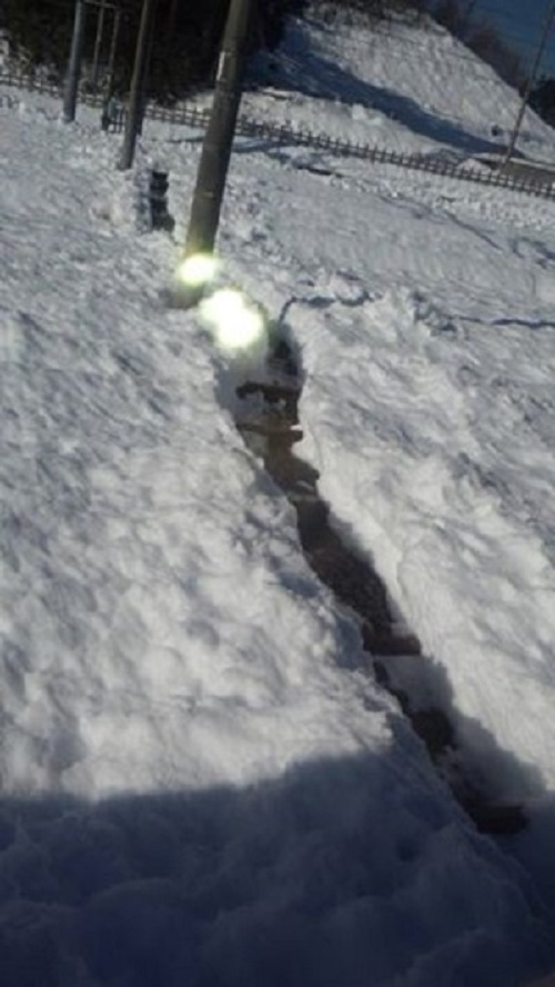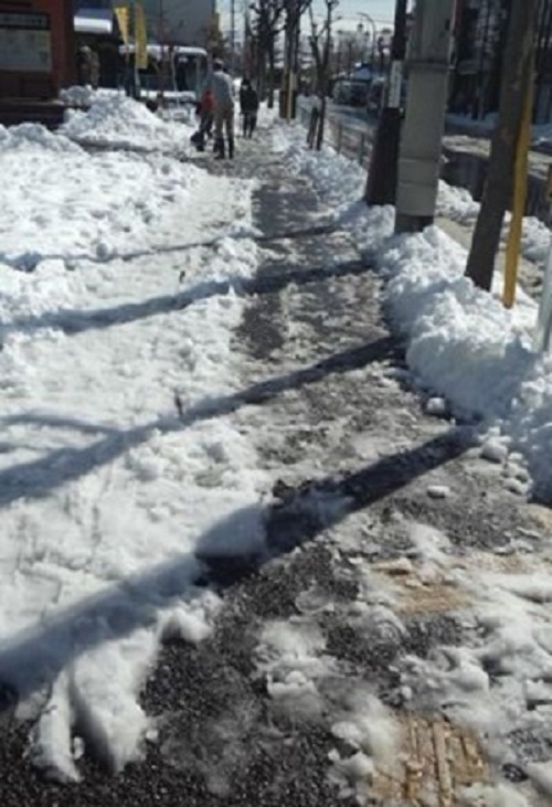 昼間、雪かきした所に、人が集中して通って、けもの道になっているので、