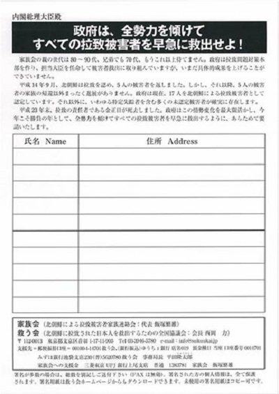 拉致被害者を救う署名用紙です。署名は1020万人を超えています。