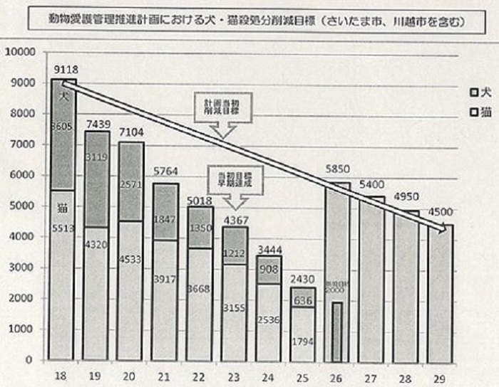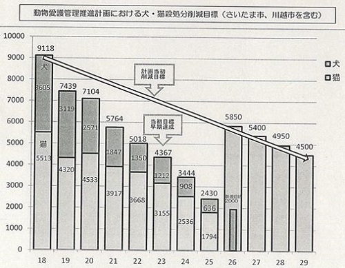 埼玉県の犬・猫 殺処分数は、平成18年度 9118頭でしたが、昨年度 2430頭(猫1794 犬636)。