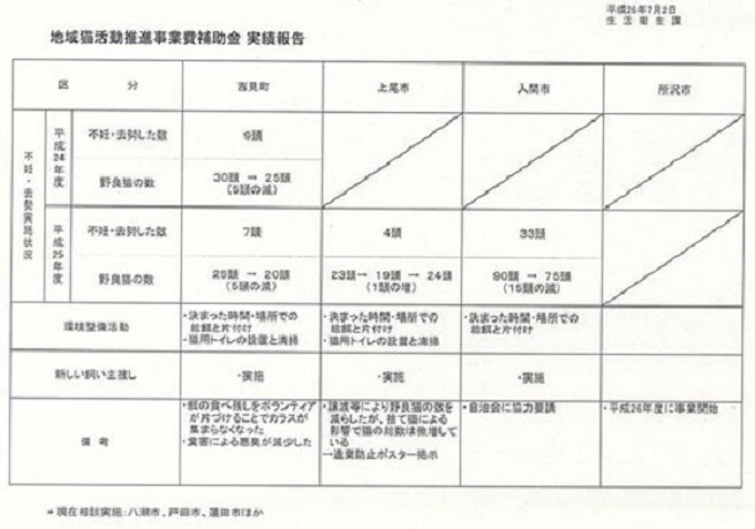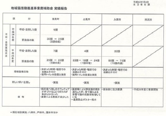 そこで、県は地域猫の補助事業を行っており、入間・所沢・上尾市、吉見町の市民団体に補助金を出しており(1地区40万円。現在、3市から新たなオファーが来ている)、昨年度、去勢手術が44頭行われました。