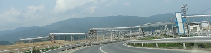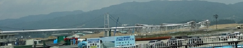 津波対策の為、山からベルトコンベアで土を運び、市街地を盛り土・かさ上げしている現地を視察。