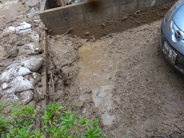 道路側(左)からの泥や雨水の流入をくい止める為に、土のうを積んで、泥をかき出し、車を上に動かした。