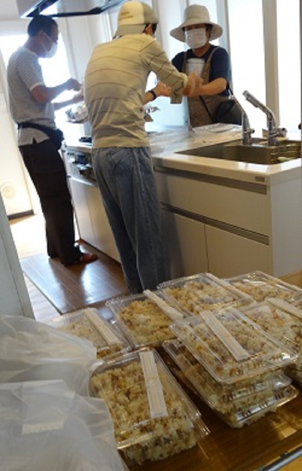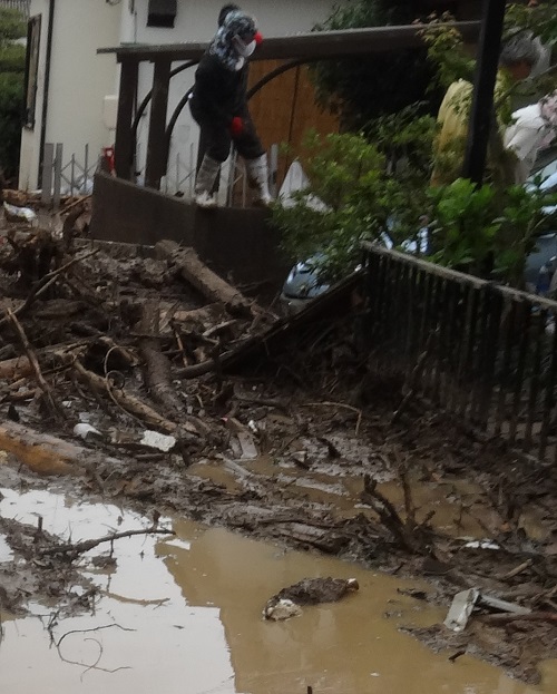 家の前の道路は、歩いて通れないほど冠水し、木やガレキが泥に埋まっている。家の駐車場が道路側に少し下っていて、これ以上浸水すると車が浸水してしまうので、駐車場の少しでも上のほうに今日動かさないと、大雨が夕方から降る予報なので車が壊れてしまう。今朝空港に着いた時に既に小雨が降り現地に着いた時は止んでいたが、今にも大雨が降り出しそうな空模様なので急がなければとあせるが、畳3枚分の広さの泥を大人4人でかき出すだけで1時間半はかかった。これでは高齢者は途方に暮れてしまう。泥を土のう袋に入れて、長い時間運ぶのは大変だ。