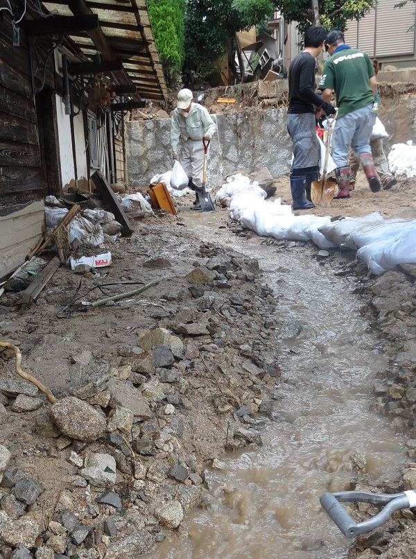 いつの災害でもそうだが、家の敷地内は復旧作業の重機は入れないので、住民やボランティアが手作業でやるしかない。