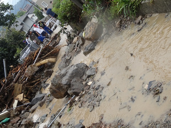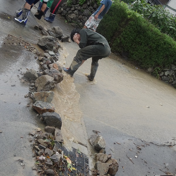 道が川になってしまうので、石などを積んで排水溝へ雨水を流し、下の住宅に行かないようにする。