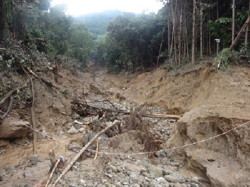 土砂崩れ現場(上部)。 地面がいかに深く削られているか、木の植わっている位置を見ると、良くわかる。
