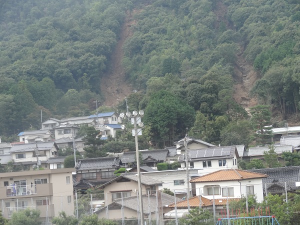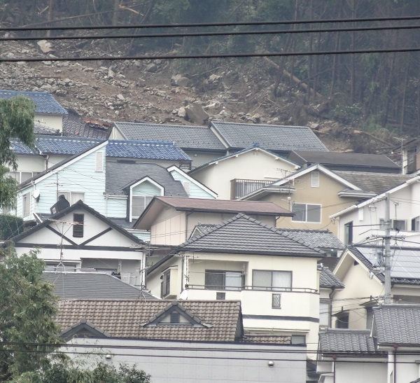 TVでよく出て来る県営住宅周辺の山崩れ現場(写真一番上から崩れているのが分かる)。