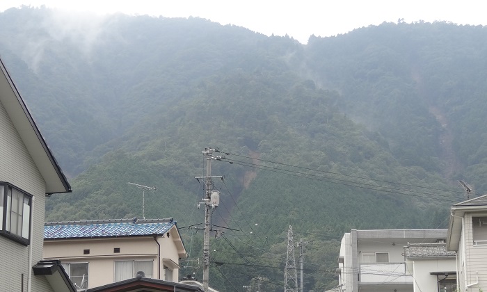 土砂崩れ現場と、住宅街。