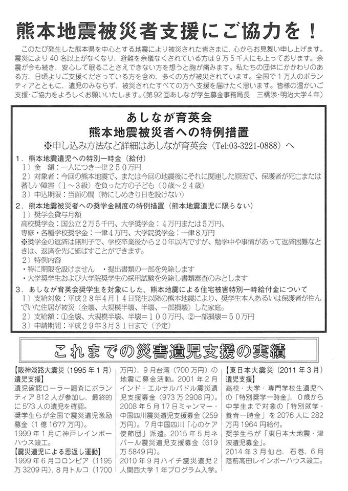 阪神大震災・東日本大震災での遺児のメッセージが記載。