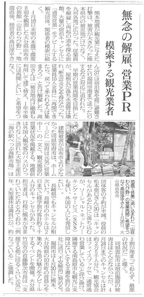 宿泊キャンセル・風評被害、鹿児島も・・・熊本地震 読売新聞 4月28日