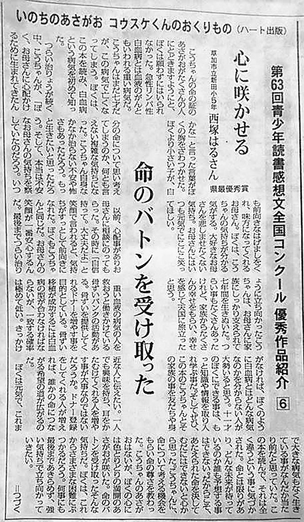 所沢市出身のプロ野球選手が、埼玉の骨髄バンク団体主催の『いのちを考える』読書感想文の表彰式に今年度、来てくれたと聞きました。