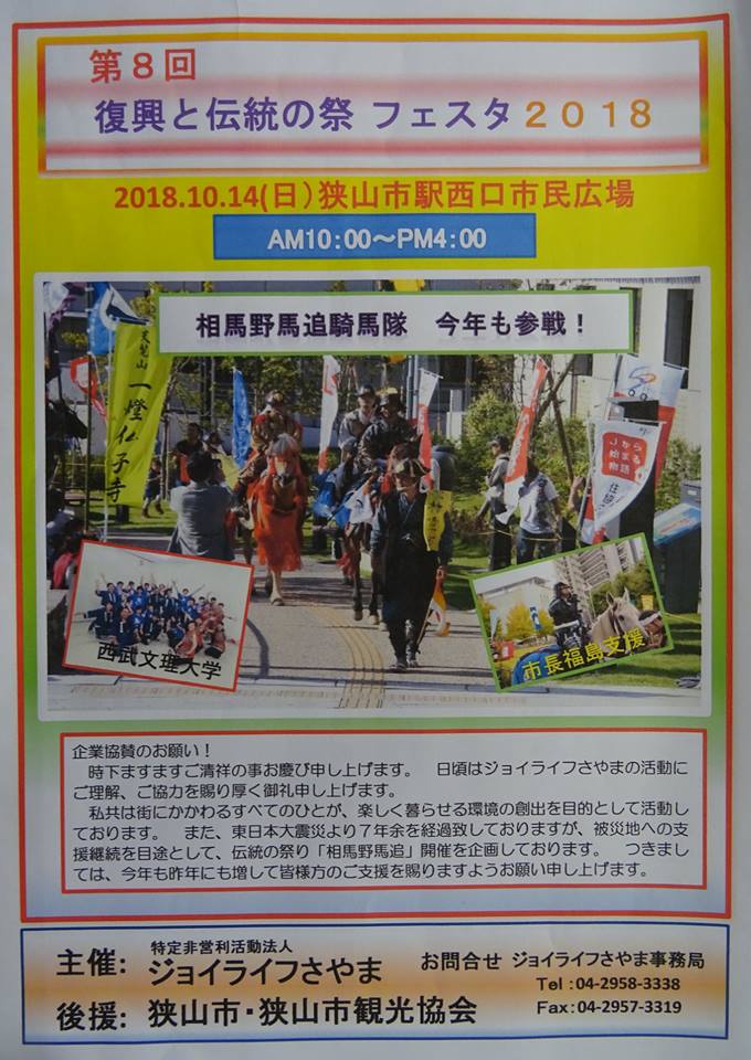 相馬馬追】6回目のイベントが、10月14日(日)、狭山市駅西口広場で。入場無料。復興応援イベントは、今年で8回目。
