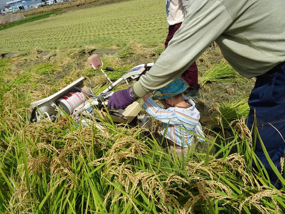 稲刈りの機械を、農家の方は、こうやって孫とやり始めるのでしょうね。
