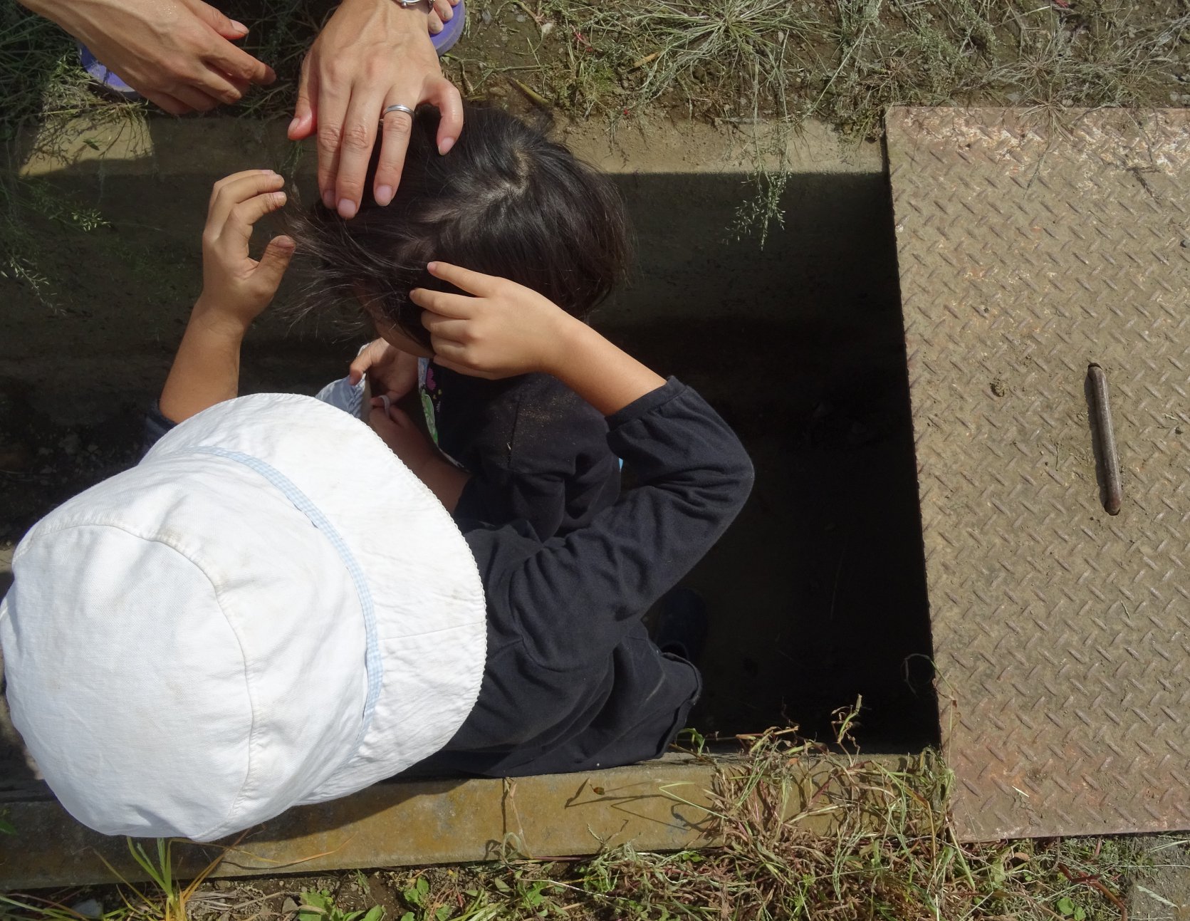 水路で遊んでいて、頭をぶつけ、泣いてる所を、近くにいた子が、ケガしていないか髪の毛をかきわけて見てくれていています。よその親もかけ付けて、一緒に頭をなでてくれています。この子の親は近くにいません