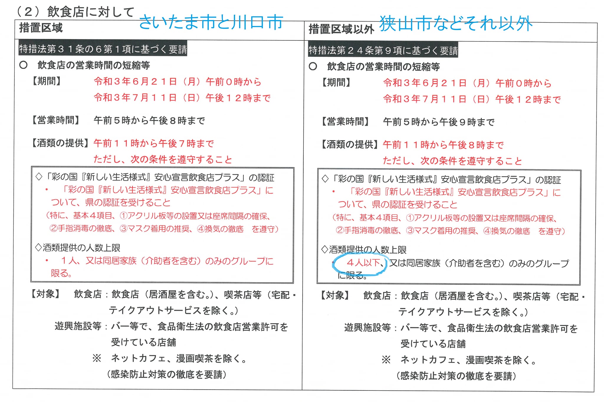 狭山市など『まん延防止地域』にこれまで入っていなかった地域で、認証を受けて来た所は、情報取得が得意な飲食店ではないかと思われ、そうでない所は比較的情報が届く・対応をして頂くのに時間がかかる恐れがあると思っていたほうがいいと思います。何より、こうして私の記述を見て頂いている方以外は、それを知った時に「なんだよ」と思われてしまうのを避けたいと思います。