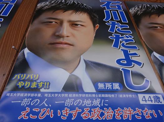 「一部の人に、えこひいきする政治を許さない」ポスター。 — 石川 忠義さんと一緒です。
