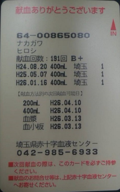 献血(狭山市役所)。191回目。