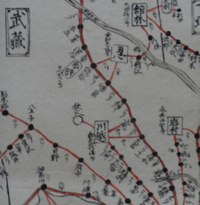本居宣長が書き写した埼玉の地図。川越・岩付(岩槻)の他、のぼうの城の”忍”が見える。