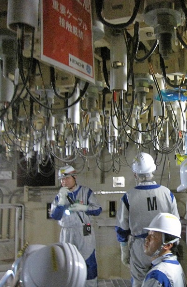 原子炉燃料棒の下(ペデスタル)に入った(かがんでいないと、立っていられない)。中性子の計測器が、180本の燃料棒それぞれに付いている。