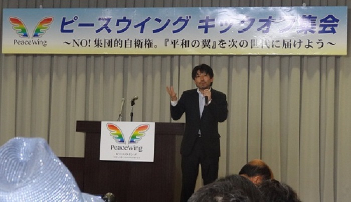 集団的自衛権 【違憲訴訟】 を目指すピースウイングキックオフ集会で、演説する三重県松阪市長。