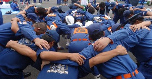 狭山市消防団第5分団(奥富地区)の選手の皆さんが、競技を終えて、報告に見えたところ。