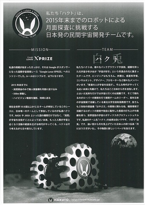2015年末までに、民間資金のみで、無人探査機を月面着陸させ、500mを移動し、360度のハイビジョン動画を地球に送る賞金レースに日本で唯一エントリーしている。Googleがスポンサーで、最大賞金5億円。