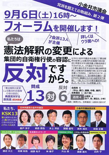 小金井市議会の超党派主催、集団的自衛権反対フォーラム。