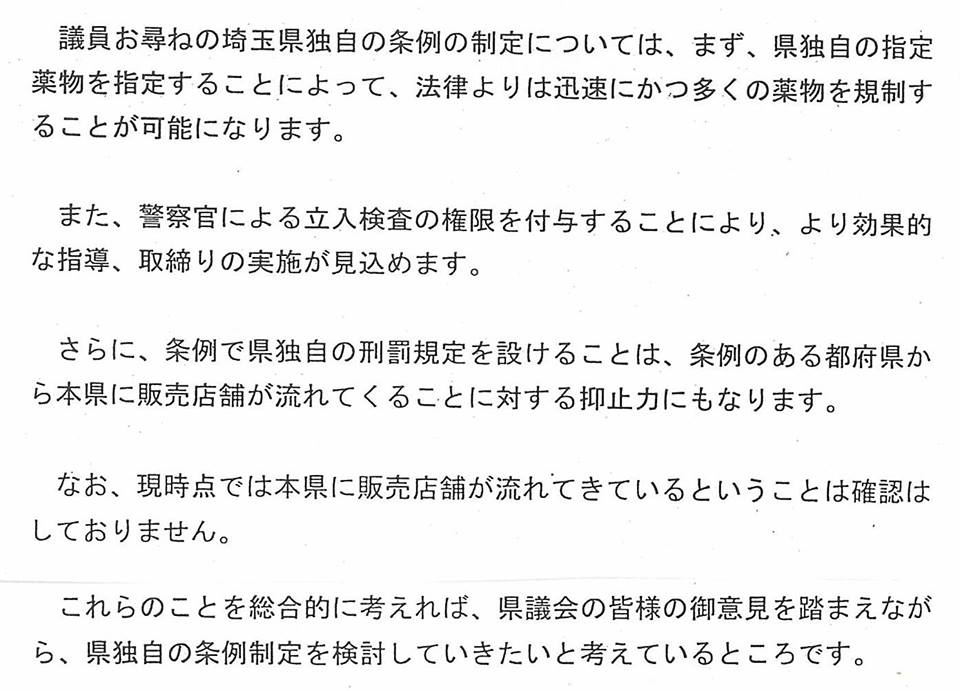私の所属する会派として取り組んでいる危険ドラッグ対策について、今日、山本正乃県議(越谷市)が一般質問し、上記の答弁を得ました。