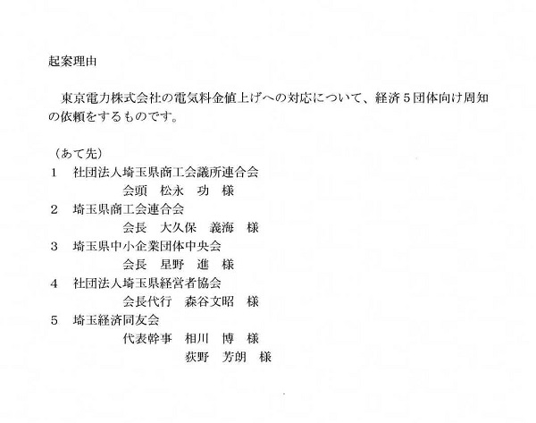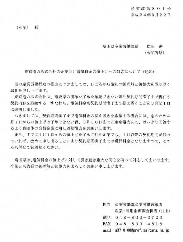 埼玉県から電気料金値上げについて企業に向けて出した文書を添付します。