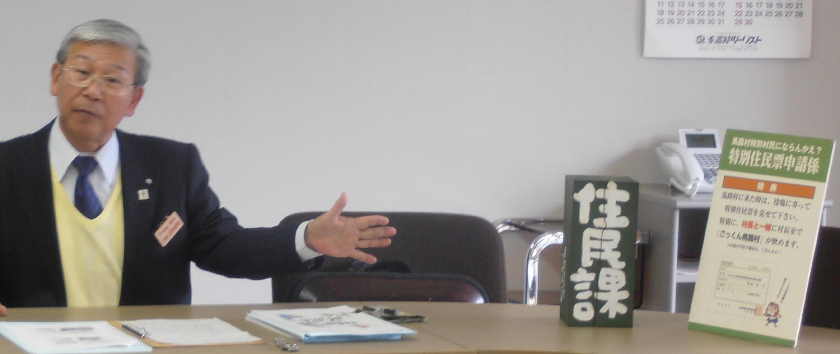 村外の人対象の『特別村民住民票』募集を説明する高知県馬路村の村長。