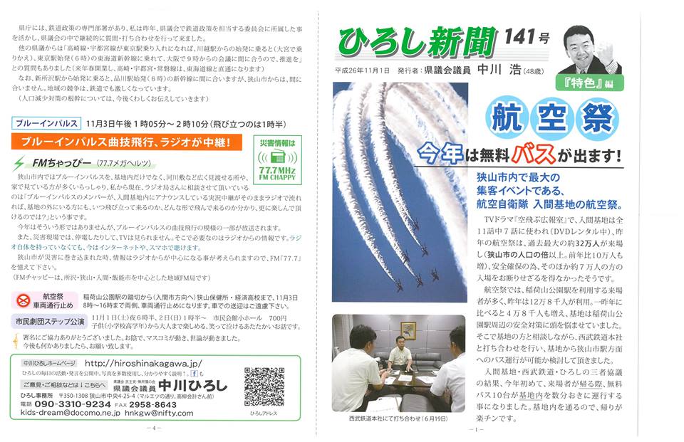 今日1日(土)、狭山市内の朝刊各紙に『ひろし新聞141号』が、折り込まれています。