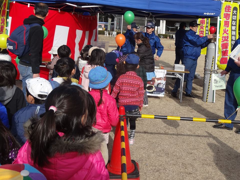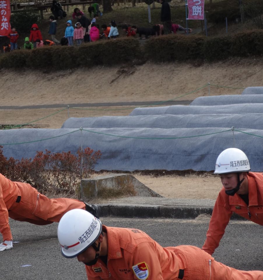 消防隊員が救助基本訓練をやっているのを、後ろで見ている子供達がマネしています。