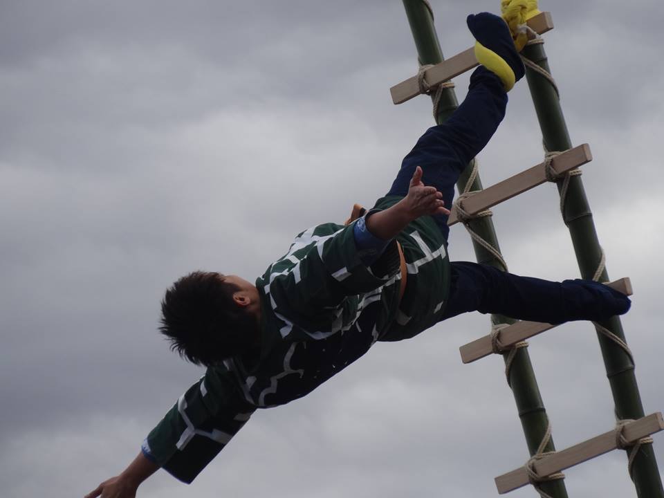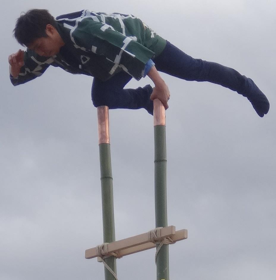 竹のハシゴは縄で結んでいるので、かなり揺れる。