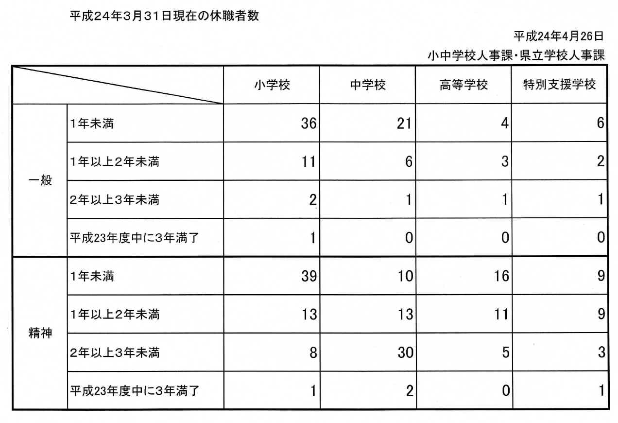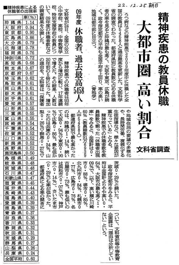 教職員の精神疾患による休職者の全国平均との比較では、2009年のデータでは埼玉県は0.62%の割合で、全国順位では休職者の割合が高い方から12位である。