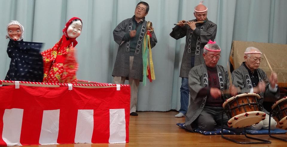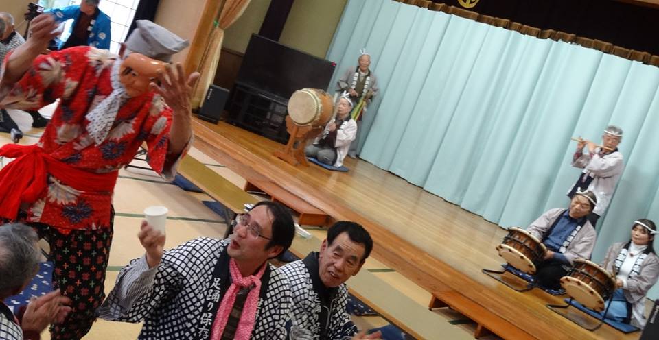 足の先で『ひょっとこ』『おかめ』のお面を付け、寝っ転がって、手で腕で操る『足踊り』。今のTVを見る楽しみみたいなものですかね。地域芸能。