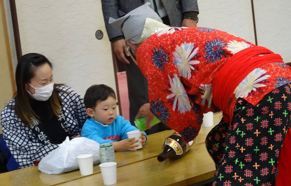 『ひょっとこ』が踊りながら、子どもにお酌。(^^)