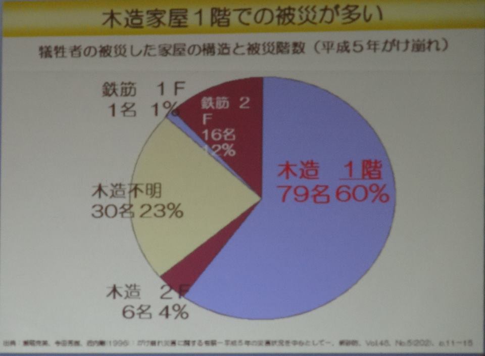 広島の土砂災害を例に、「大雨の日に寝る場合、2階で寝たほうが助かる確率が高い」と言う説明がありました。