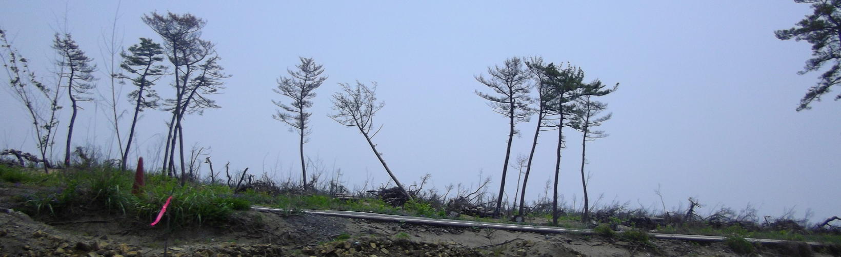 津波でなぎ倒された仙台市若林区の松林。