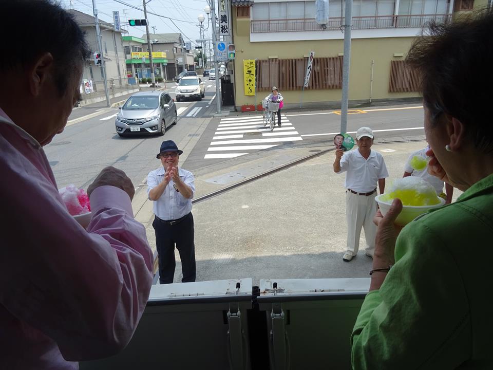 嵐山町で、カキ氷の差し入れを頂き、選挙カーで食べる滋