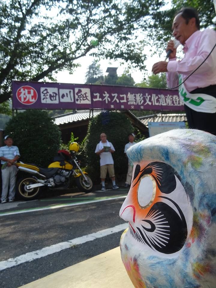 ”和紙“で作ったダルマを東秩父村の方から、上田知事に