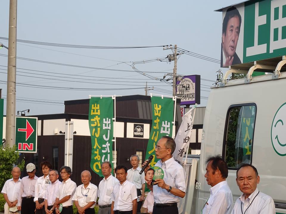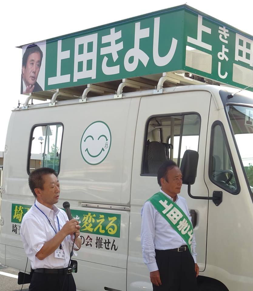坂戸市のマミーマート入西店さん前で今、上田知事 街頭演説中。