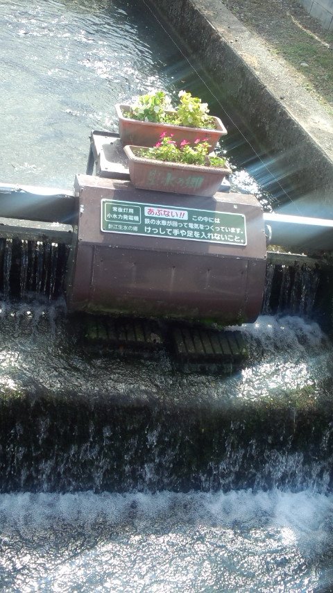 自分の住んでいる地区の小さな川で小水力発電(写真)をしたり、水車の電力で、灯篭の明かりが点いていました。
