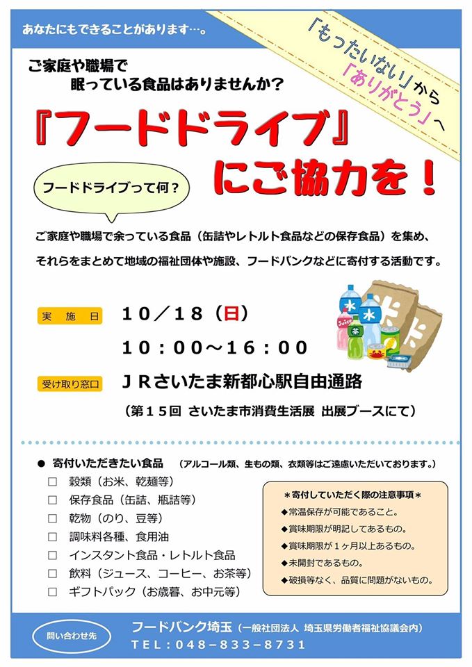 埼玉県内の労働団体を中心に18日のイベントで食品を募集しており、協力させて頂く事に。ひろし事務所に今日から18日午前中までにご持参頂ければ幸いです。ご寄附頂ければ有り難い食品は、下記チラシをご覧下さい。(事務所にご持参頂く際は、事前にご連絡下さい)