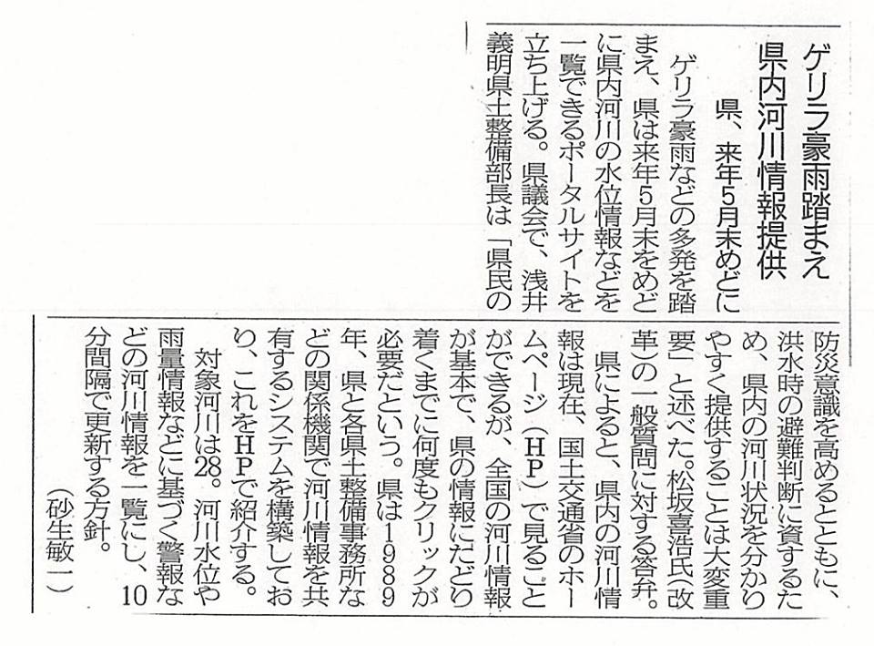 調べてみると、ネットの情報にたどり着くのに時間がかかり、ページが見つかっても分かりにくいものである事が判明。県議会での質問の結果、「来年の梅雨入り前、5月末までに県でHPを立ち上げる」と県が回答。
