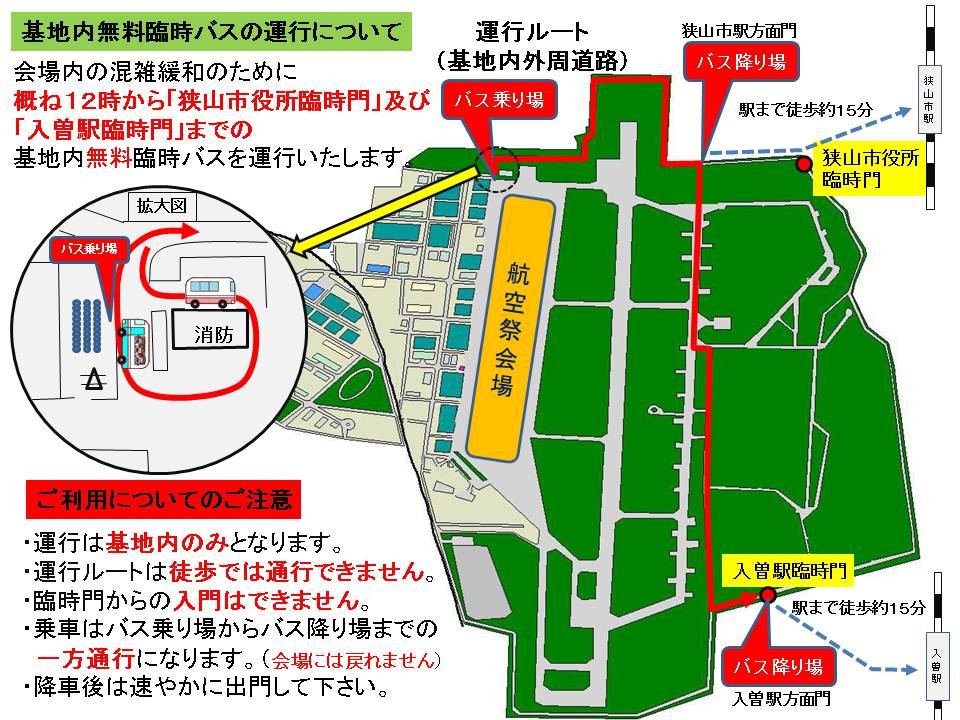 今年は、何と!!バスのルートが1つ増え、入曽駅にも行きやすくなります!!ブルーインパルスの曲技飛行が終わってからも、約5分間隔で同時に3台が出ます(全体の台数は15台くらい。5時くらいまでかと)。狭山市の人口の倍以上の方が訪れる年もある航空祭。市外の方は、ぜひ!西武新宿線で、お越し下さい。狭山市駅方向のバスは、乗降場所が『市役所前信号』に変更になります。お帰りは、入曽駅方向・狭山市駅方向によって乗るバスが違います。